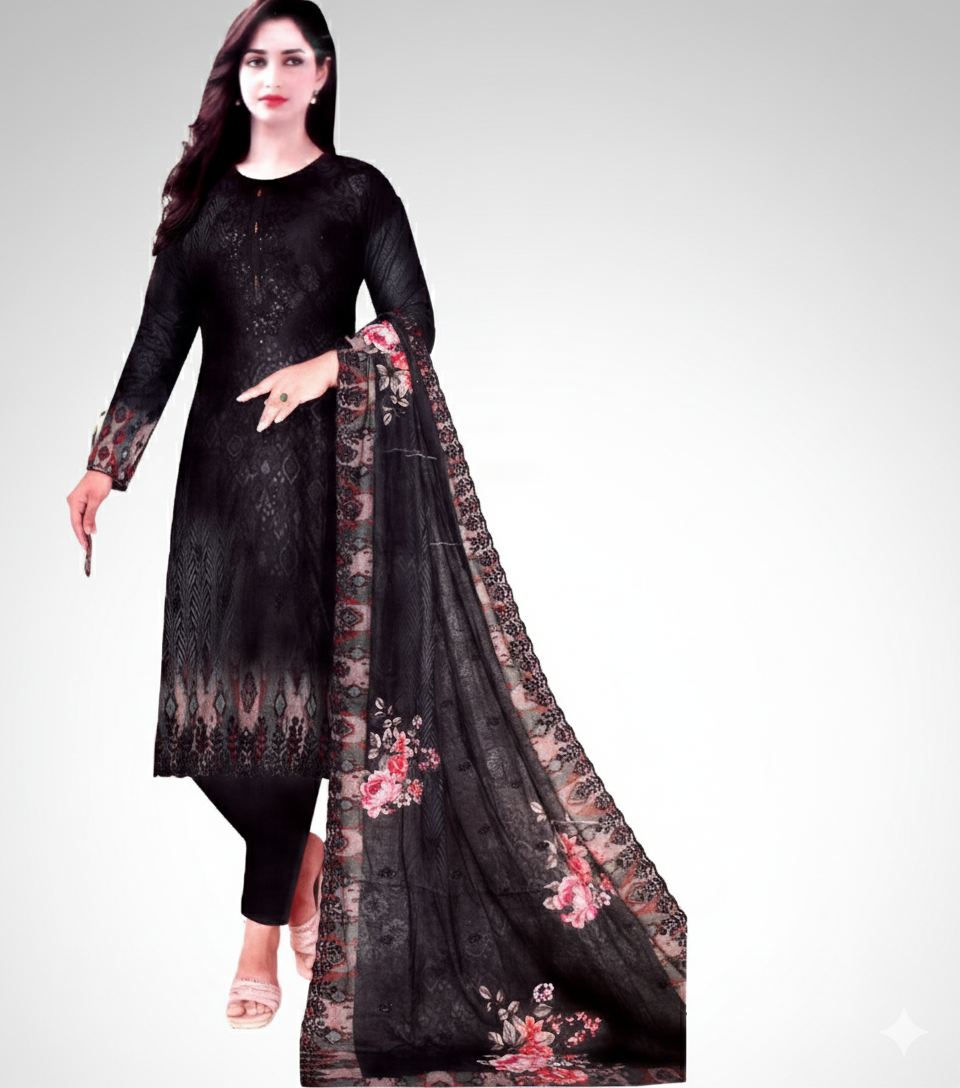 এলিগ্যান্ট ও ক্লাসিক লুকের জন্য ব্ল্যাক কালার সবসময়ই জয়ী। এই Black Premium Printed Salwar Kameez টি তৈরি করা হয়েছে সফট ও আরামদায়ক ফেব্রিক দিয়ে, যাতে সারাদিন থাকলেও কোনো রকম অস্বস্তি হবে না। পুরো কুর্তিতে রয়েছে ডিটেইলড প্রিন্ট, আর সাথে দেওয়া হয়েছে ফ্লোরাল ডিজাইনের চিনন দুপাট্টা যা পুরো ড্রেসটিকে আরও রাজকীয় লুক দেয়।